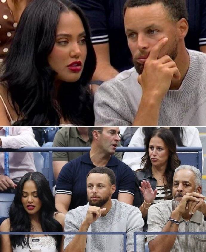 本场比赛场边,库里携妻子阿耶莎以及父亲戴尔-库里观战。