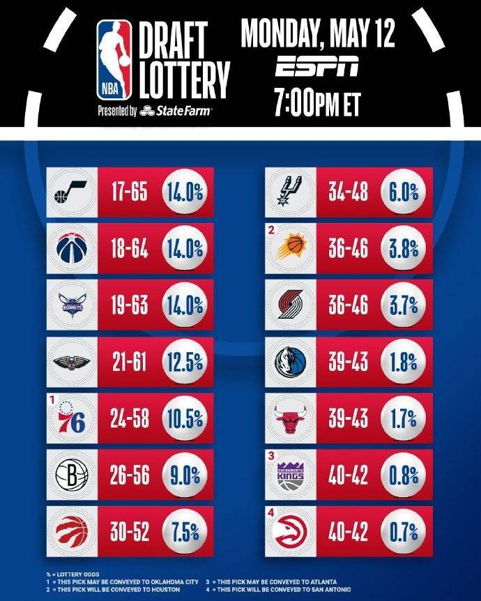 乐透区的14支球队中,爵士、奇才和黄蜂抽到状元签的概率最大,为14%;鹈鹕12.5%排在第四;76人10.5%排在第五。老鹰则是概率最低的乐透区球队。